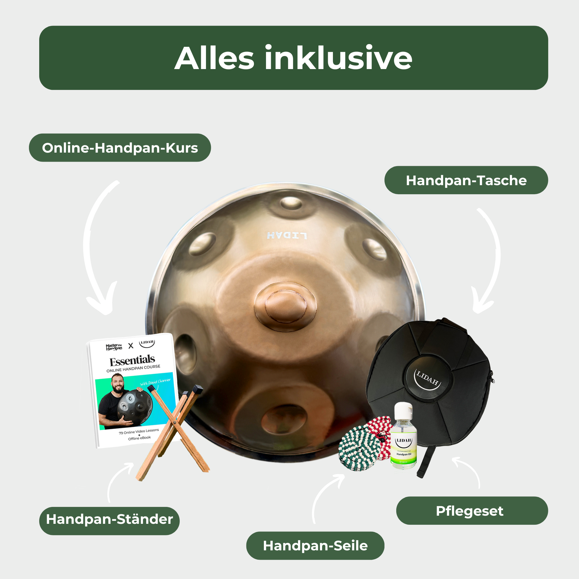 Wenn du eine LIDAH Handpan bestellst, bekommst du nicht nur ein Instrument, sondern ein komplettes Set, mit dem du deine Klangreise sofort starten kannst:
