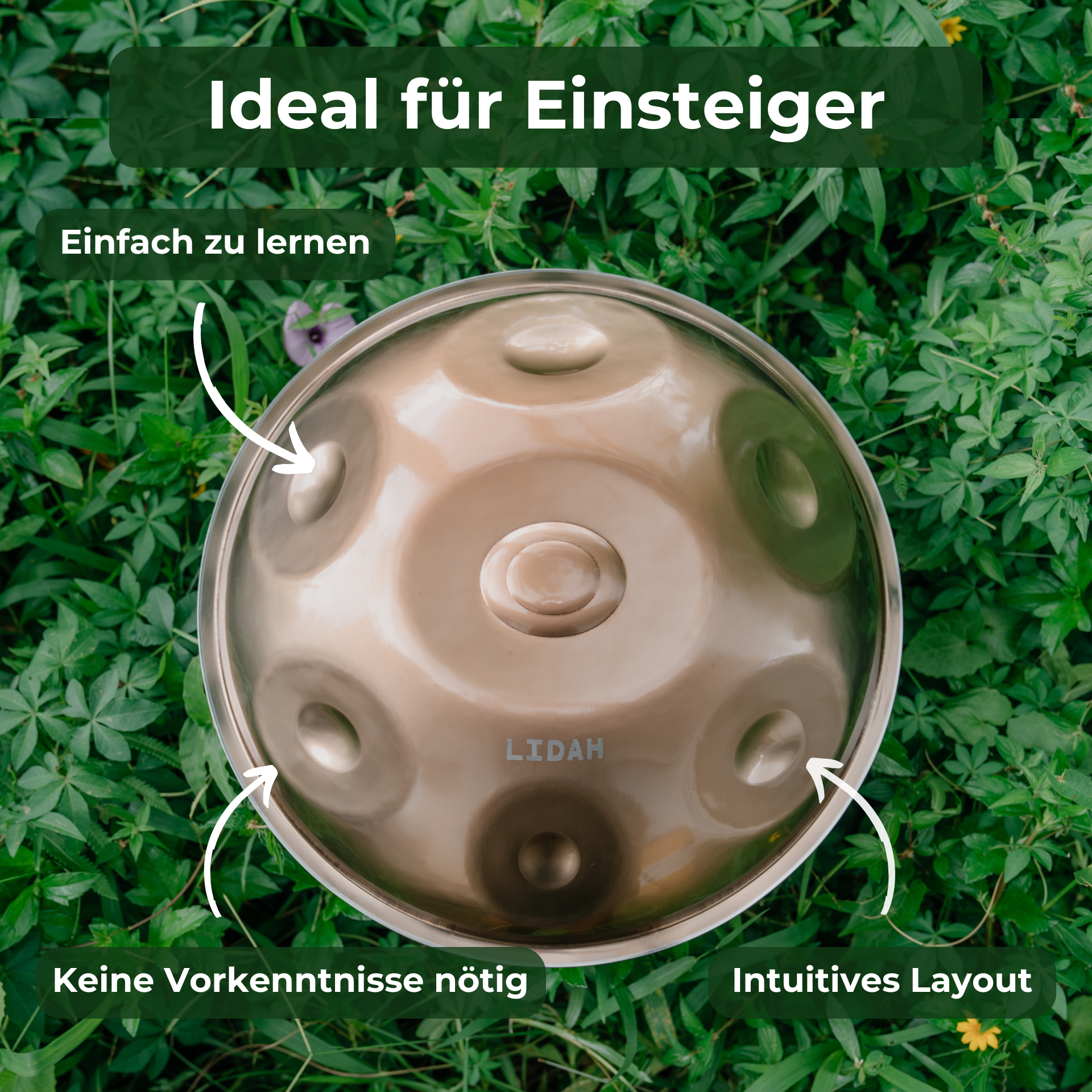Gar nicht schwer. Da alle Töne zur gleichen Skala gehören, klingen sie immer harmonisch zusammen. Du brauchst keinerlei musikalische Vorkenntnisse, um schöne Melodien zu spielen. Die meisten Anfänger können schon nach wenigen Tagen einfache Rhythmen spielen. Mit etwas Übung entdeckst du schnell mehr Muster und Techniken. Damit du gut starten kannst, enthält jede Handpan lebenslangen kostenlosen Zugang zum Kurs „Master the Handpan“ mit über 70 Schritt-für-Schritt-Videolektionen. So macht das Lernen Spaß und bleibt in deinem eigenen Tempo leicht zugänglich.