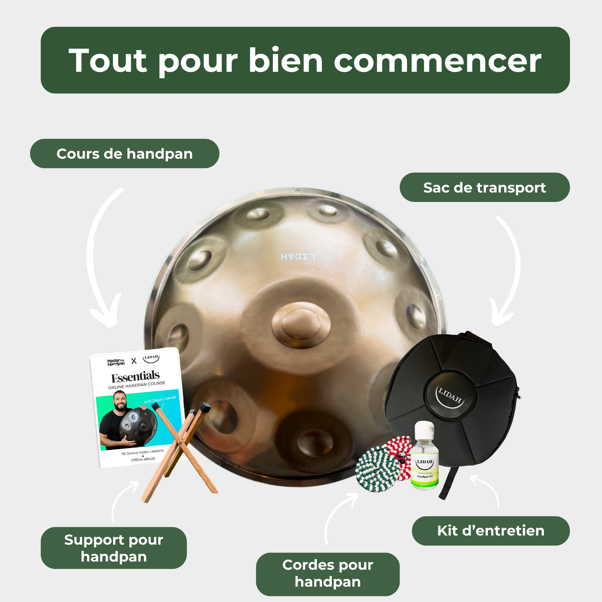 Lorsque vous commandez un handpan LIDAH, vous ne recevez pas seulement un instrument, vous recevez un package complet pour commencer votre voyage immédiatement :